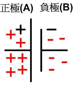 - 在下圖中,介電質分子因電場影響而旋轉,旋轉後產生反向的電場,因此抵消了部份原有的電場,這個效應稱為電極化。